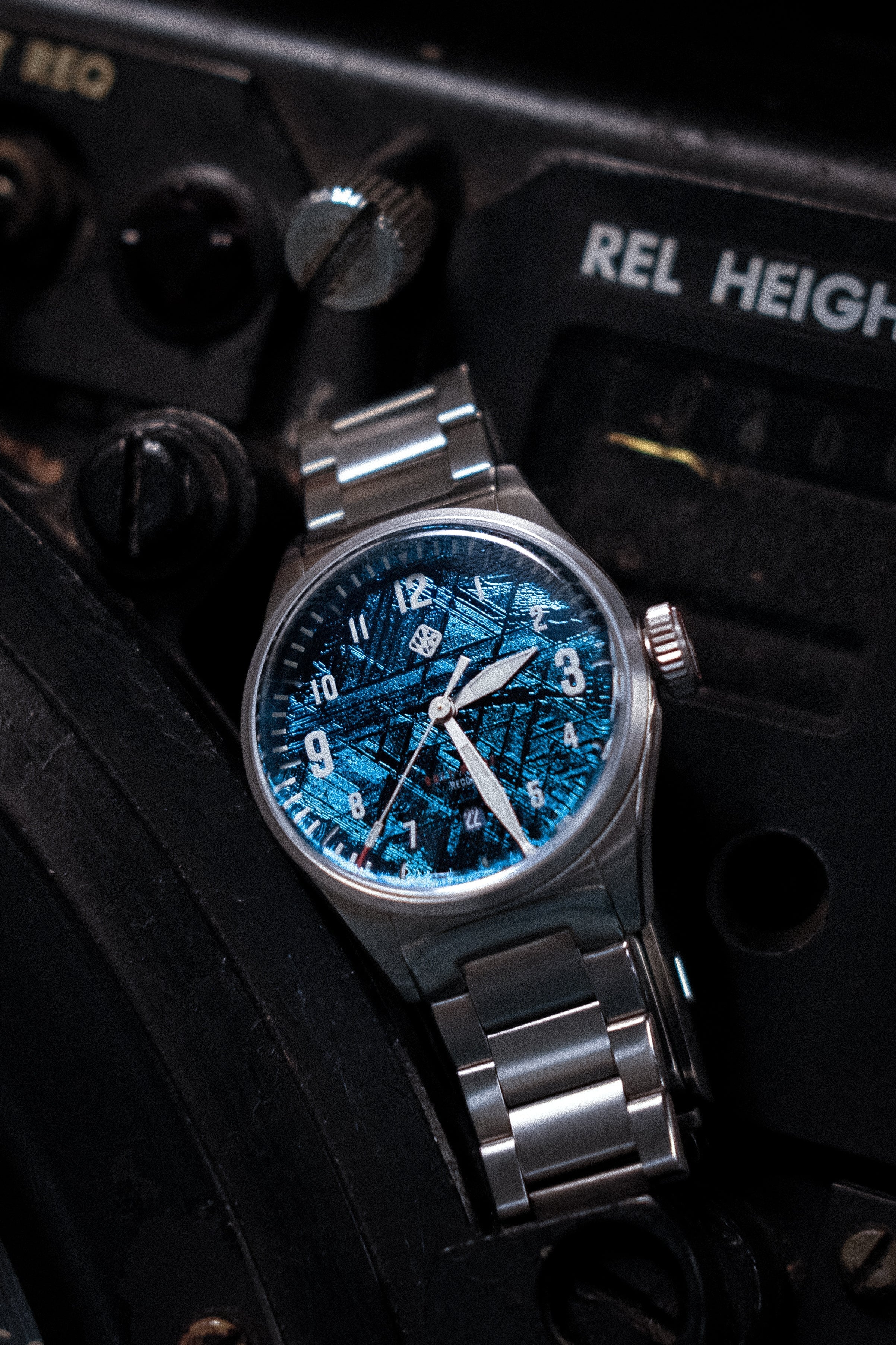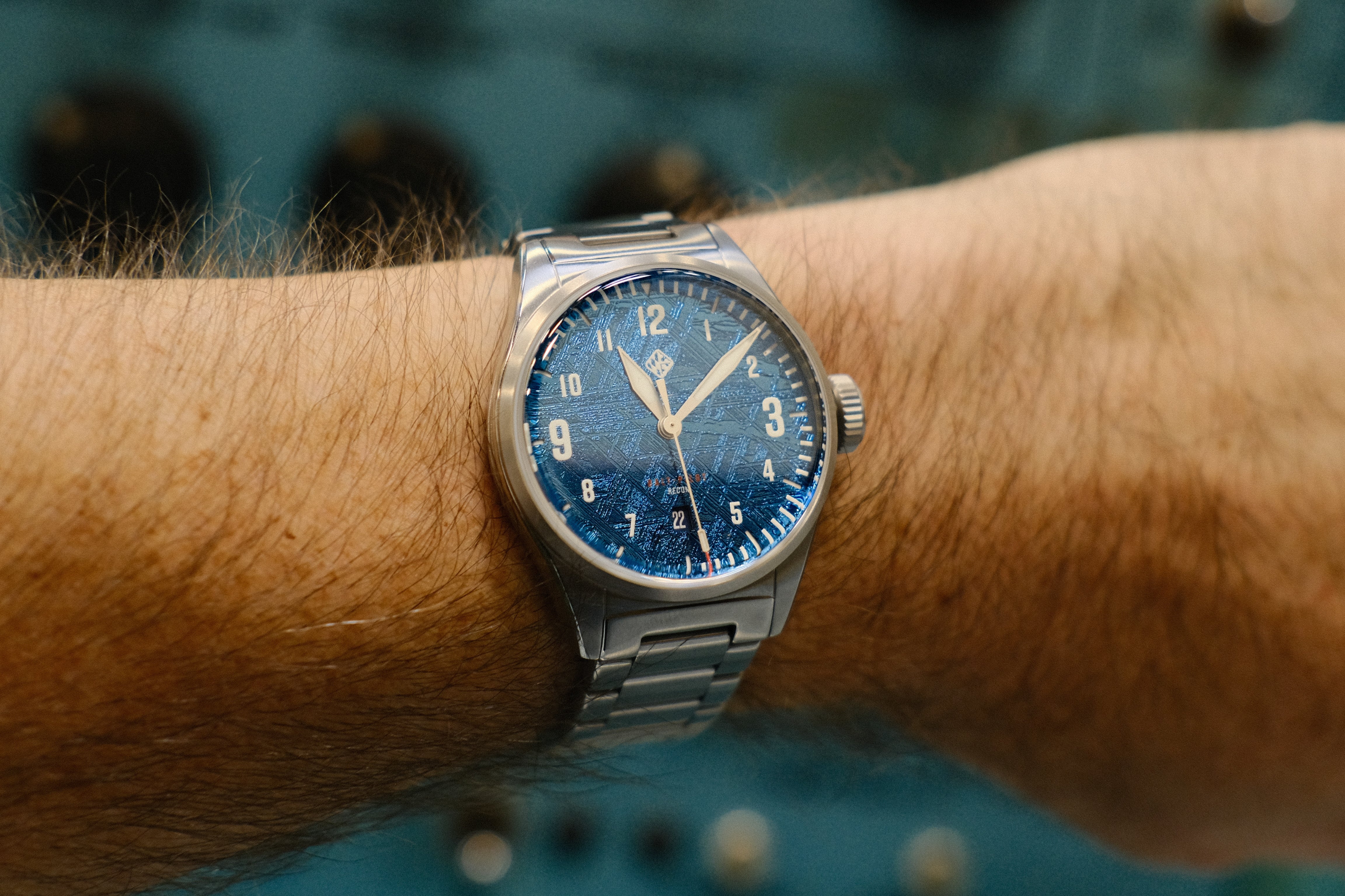 The Meteorite dial is sourced from Sweden, from the Muonionalusta Meteorite rock, that’s a million years old and was found just 100 years ago on earth. We added a blue PVD coating directly on top of the natural meteorite, creating a stunning blue finish.