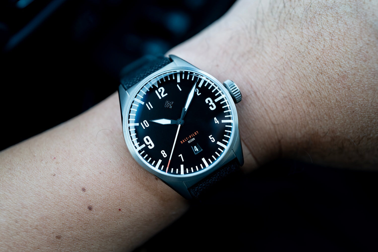 The Balt-Pilot is a lightweight titanium Pilot watch named after the Martin 187 Baltimore (A-30). The Martin 187 was used in WWII by US allies and was eventually nicknamed "The Balt". The Martin 187 Baltimore was a twin-engined light attack bomber built by the Glenn L. Martin Company based in Maryland.
