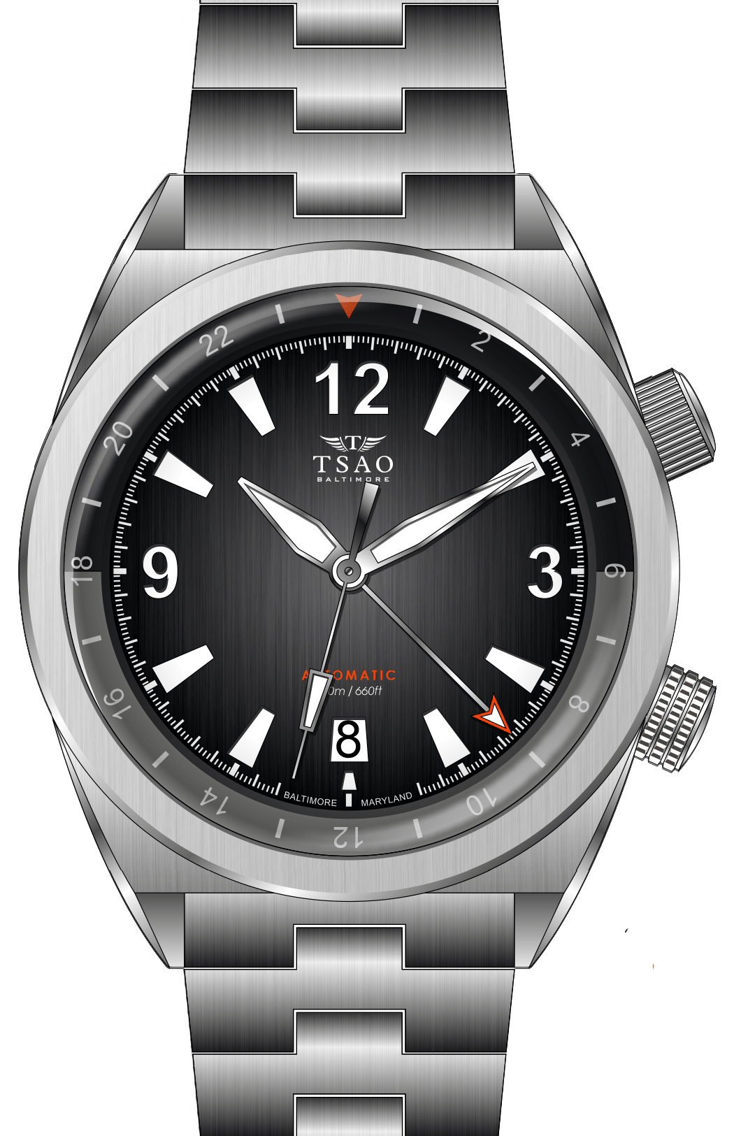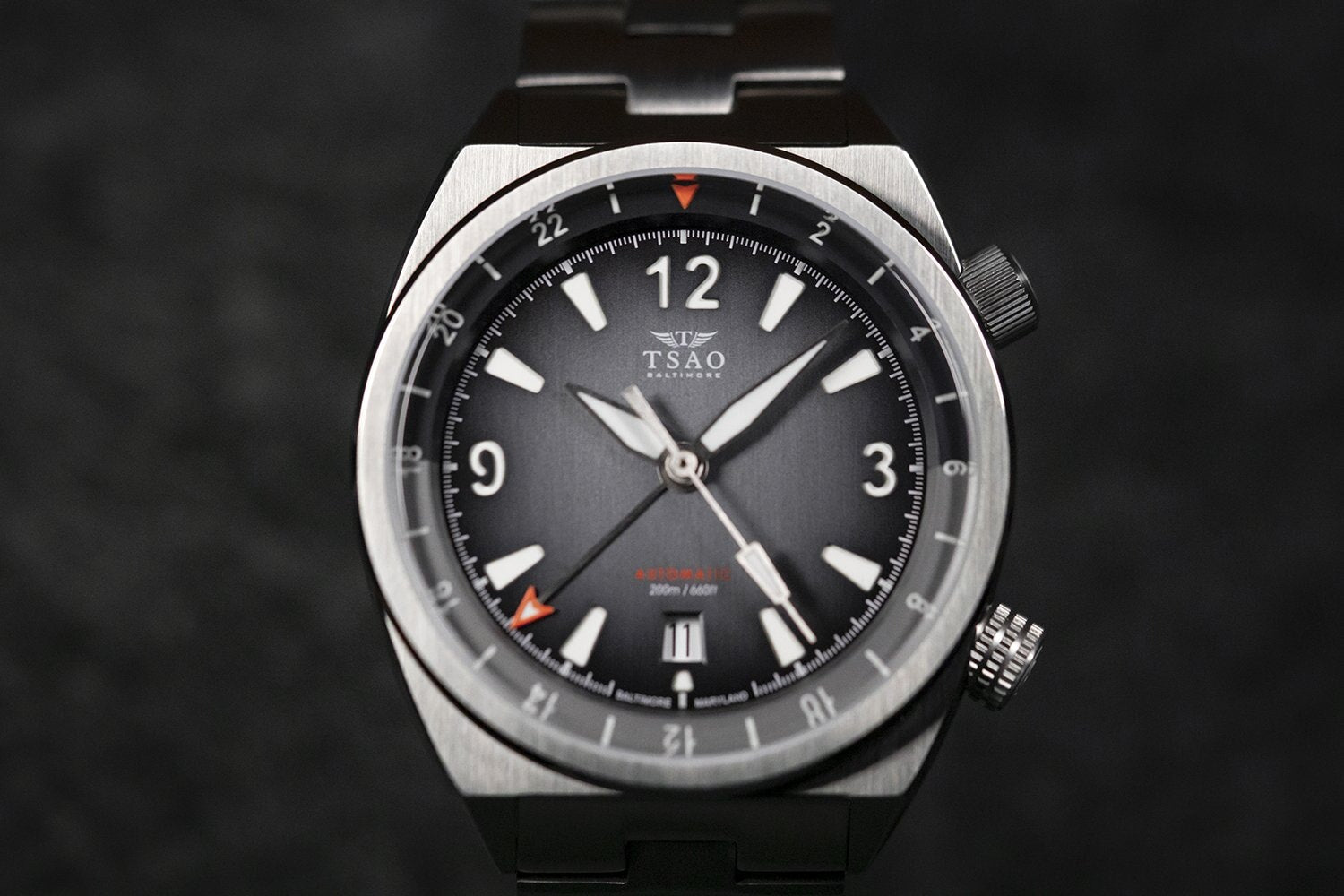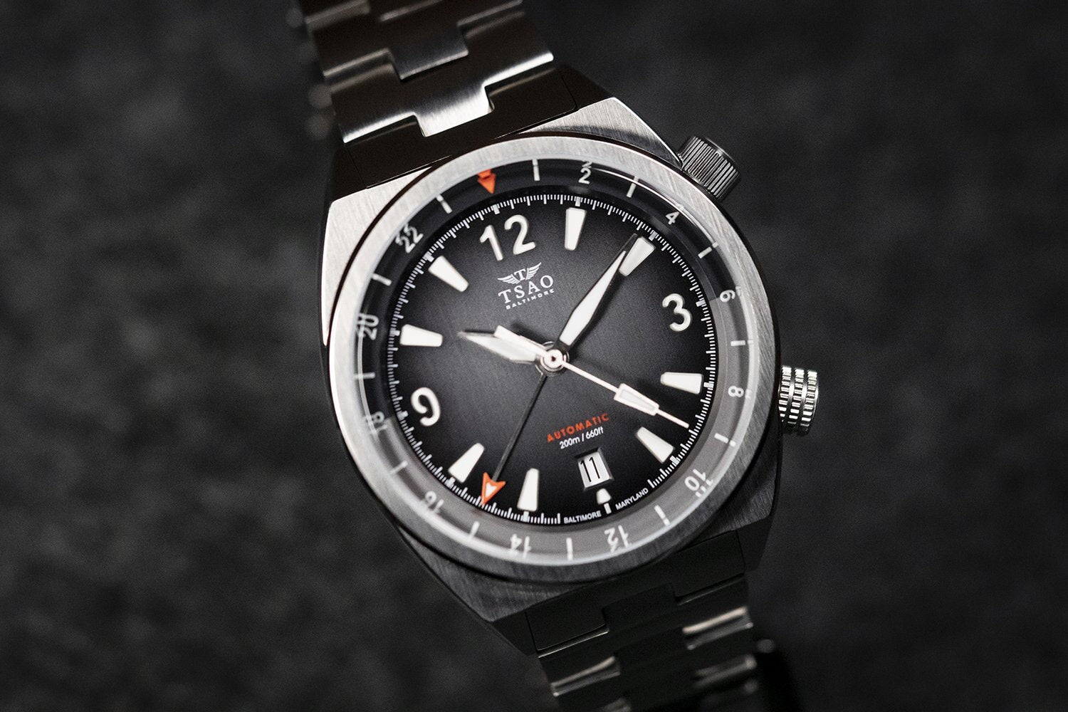 The 40mm Legacy takes on an angular, modernist take on the super compressor dive watch formula. The case combines distinctive dual crowns at 2 o’clock and 4 o’clock with a razor sharp tonneau case design. The industrial brushed finishing emphasizes the sharp lines of the design, while the raised external bezel gives the case a bold visual presence on the wrist. In keeping with the super compressor dive watch look, the Tsao Baltimore Legacy offers a dive-ready 200 meters of water resistance.