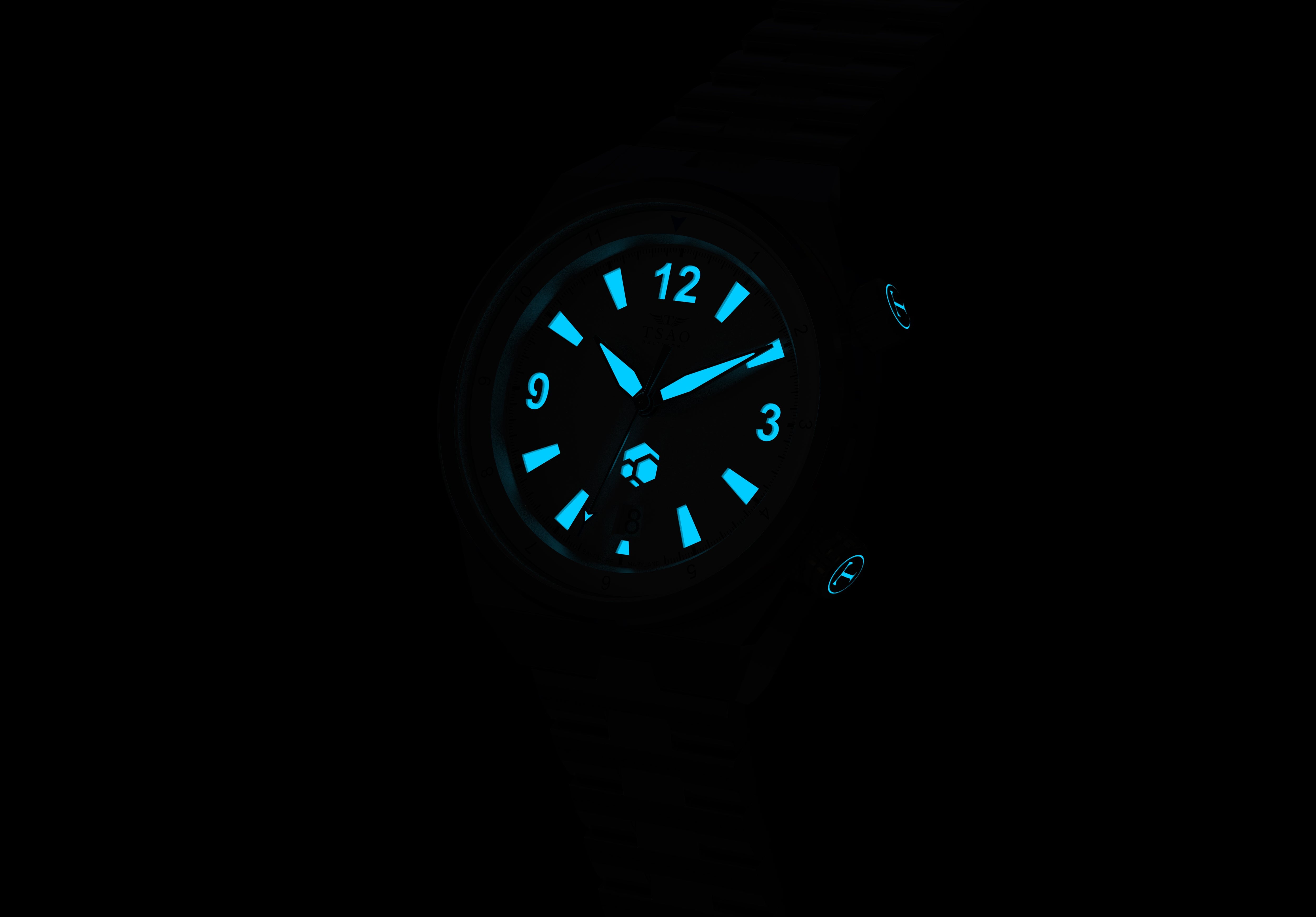 The 40mm Legacy takes on an angular, modernist take on the super compressor dive watch formula. The case combines distinctive dual crowns at 2 o’clock and 4 o’clock with a razor-sharp tonneau case design. The industrial brushed finishing emphasizes the sharp lines of the design, while the raised external bezel gives the case a bold visual presence on the wrist. In keeping with the super compressor dive watch look, the Tsao Baltimore Legacy offers a dive-ready 200 meters of water resistance.