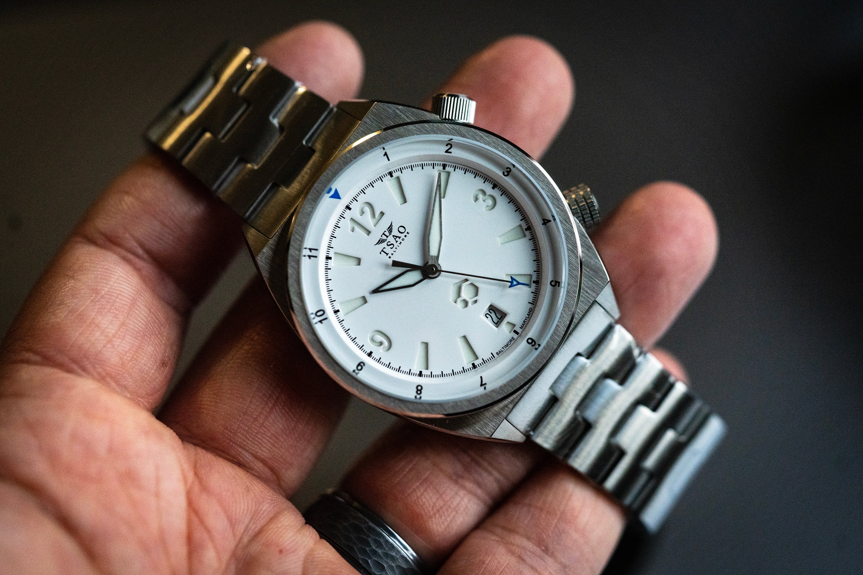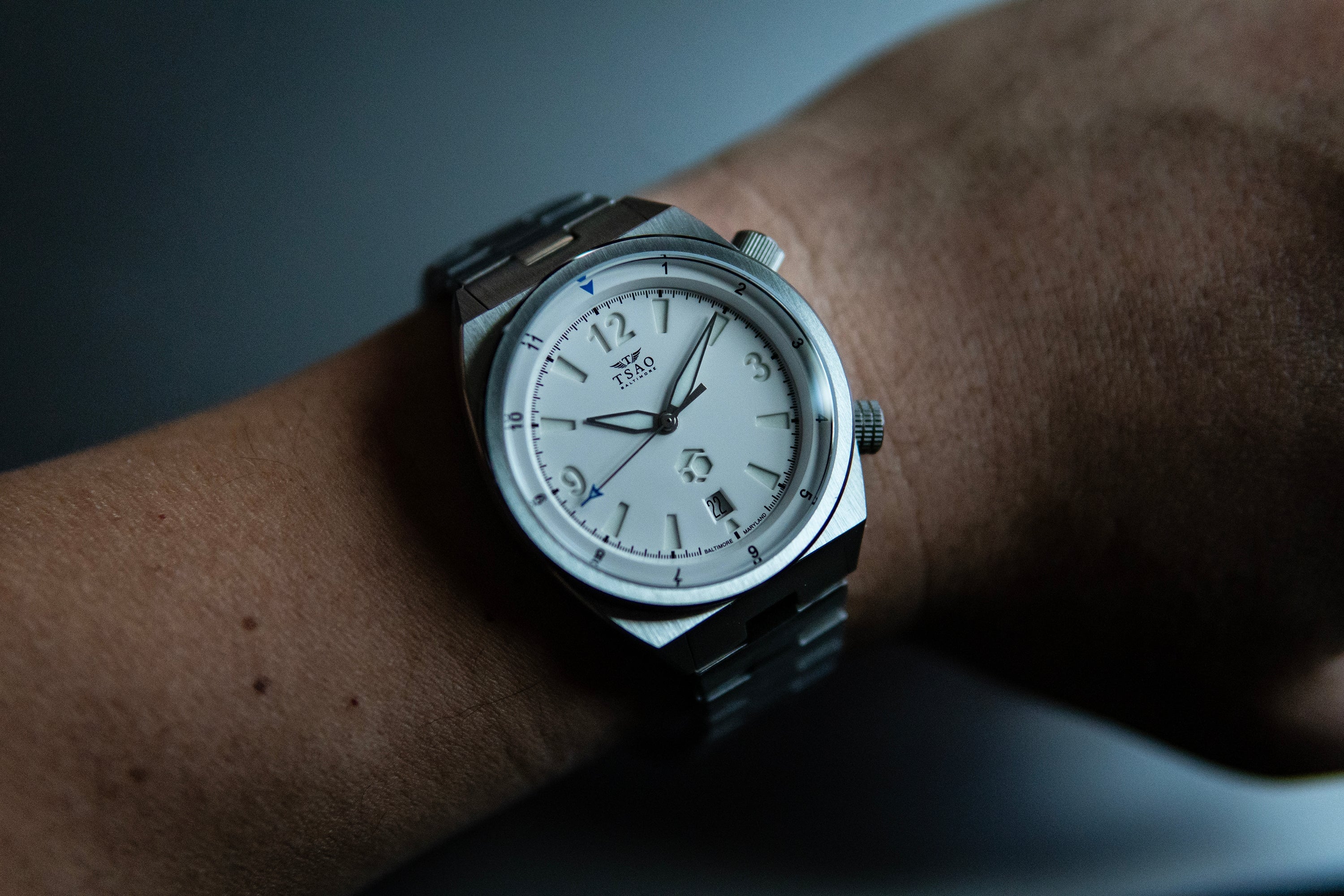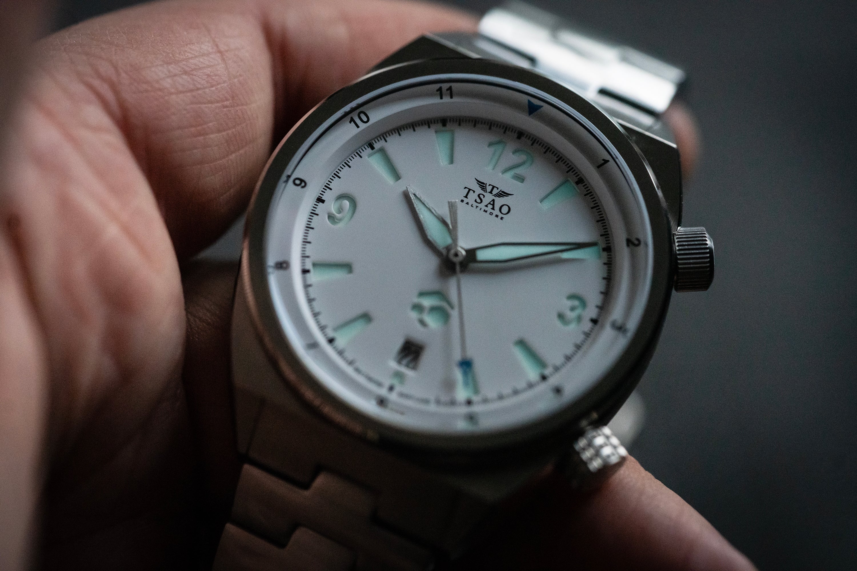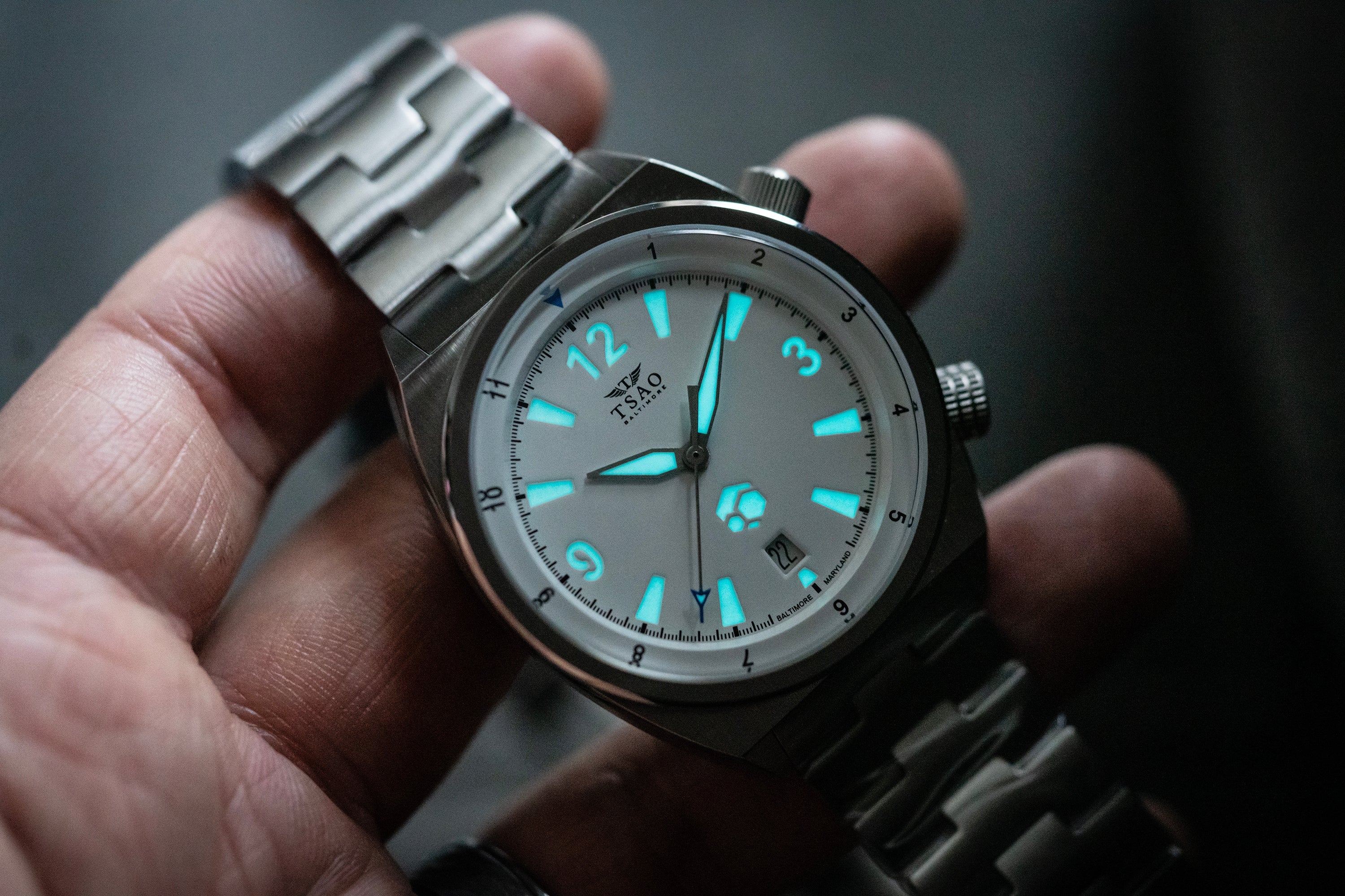 The Titan Legacy Flux Edition incorporates a tall bidirectional internal rotating bezel with deep cutouts for the mix of Arabic numerals and indices, along with classic pilot watch style hands and a stark white dial with a lumed Flux icon.