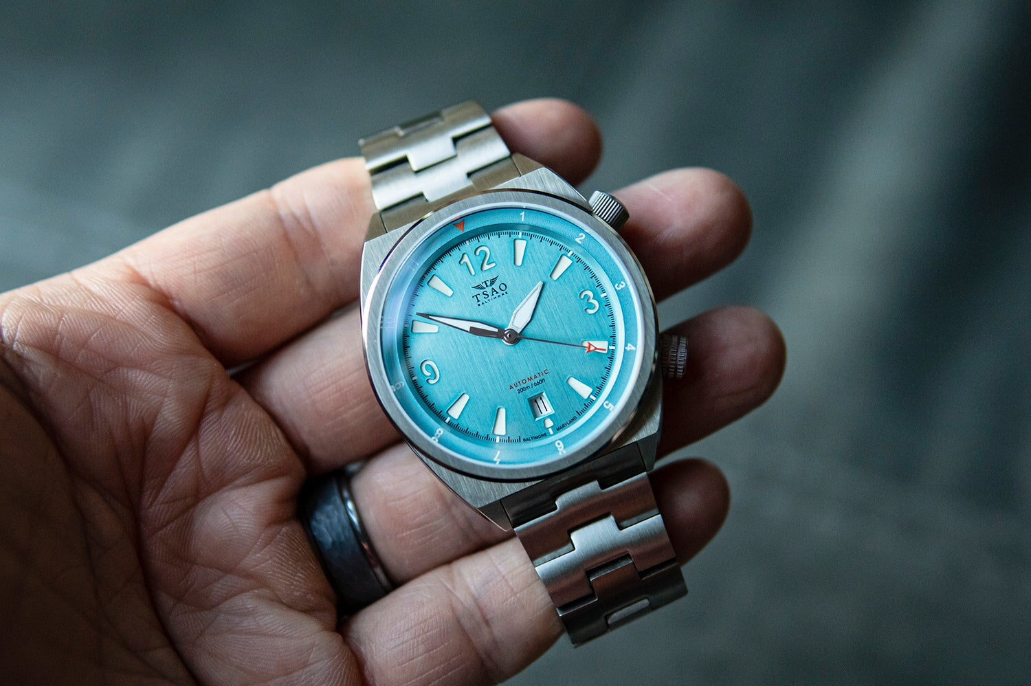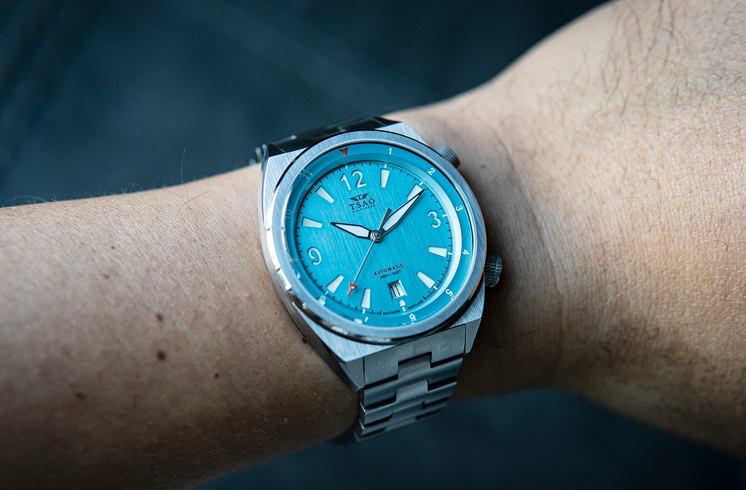 The 40mm Legacy takes on an angular, modernist take on the super compressor dive watch formula. The case combines distinctive dual crowns at 2 o’clock and 4 o’clock with a razor sharp tonneau case design. The industrial brushed finishing emphasizes the sharp lines of the design, while the raised external bezel gives the case a bold visual presence on the wrist. In keeping with the super compressor dive watch look, the Tsao Baltimore Legacy offers a dive-ready 200 meters of water resistance.