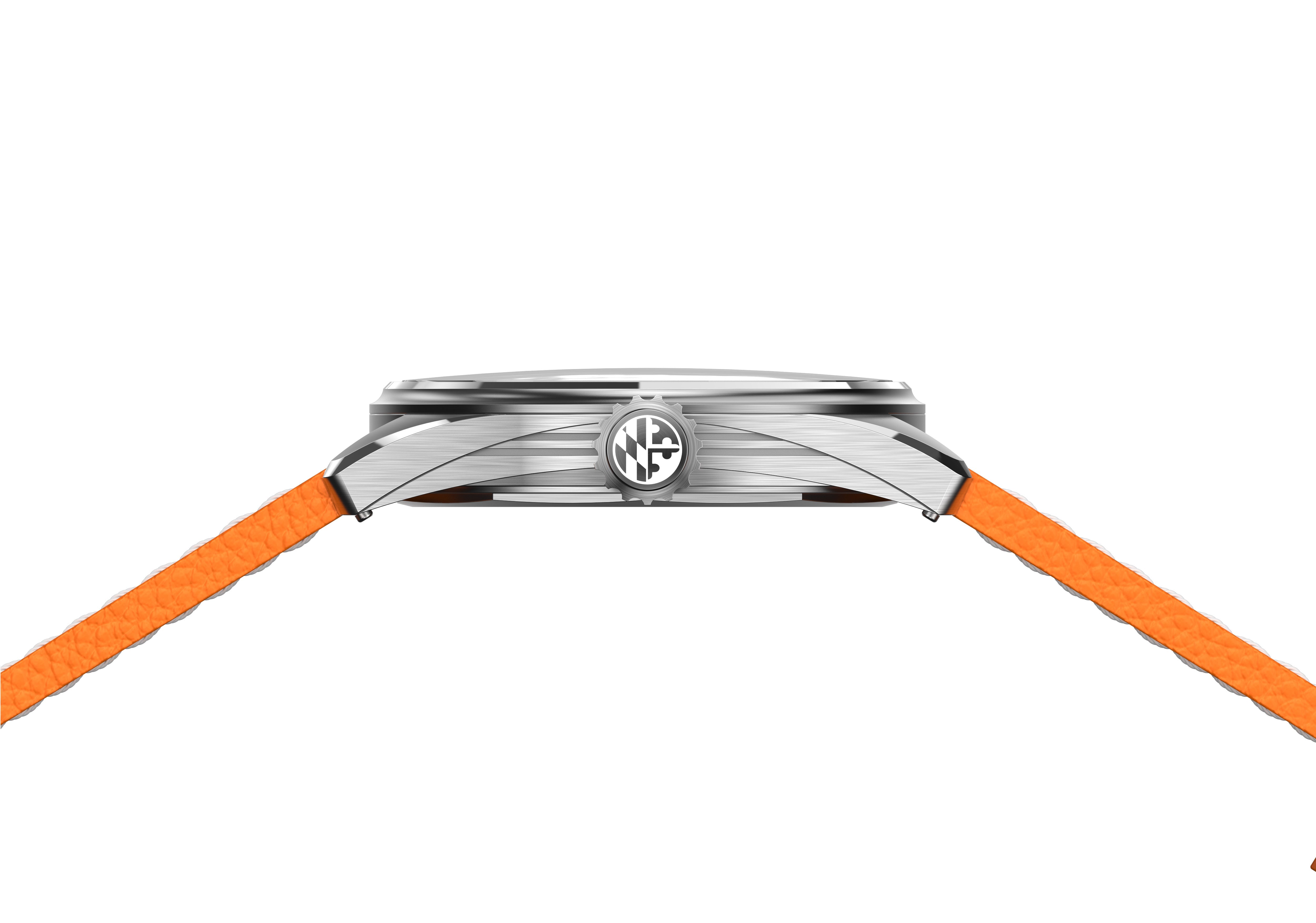 Limited to only 100 timepieces, the Natty Boh Moon - Full Lume Camden Orange is a fun and unique design, incorporating a Camden Orange moon phase disc and Swiss SuperLuminova coating on the dial, allowing it to absorb light and glow in the dark - Great for low light visibility.  Powered by a Swiss Quartz movement with a Moonphase complication, this piece measures 40mm in diameter and only 10mm thick.