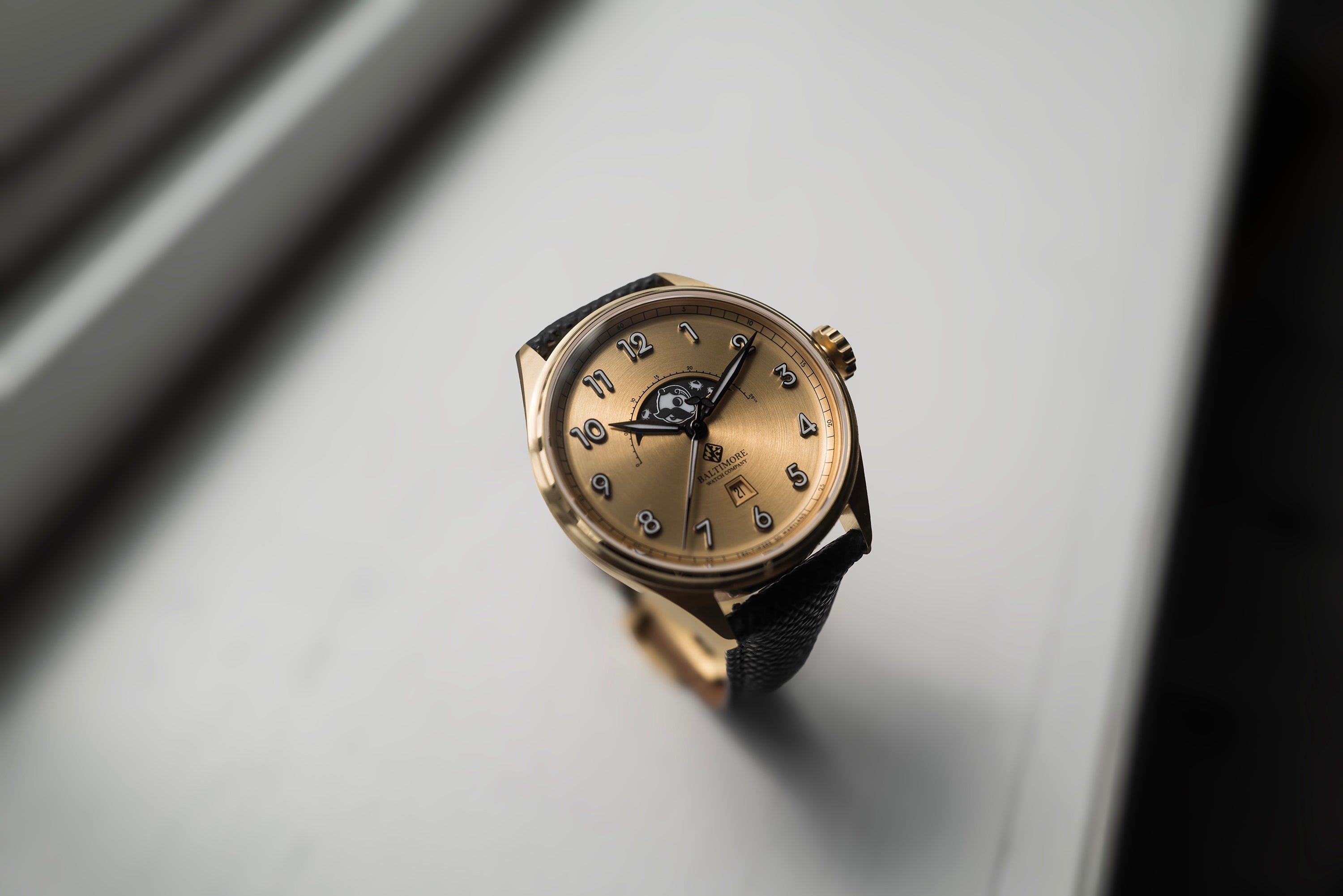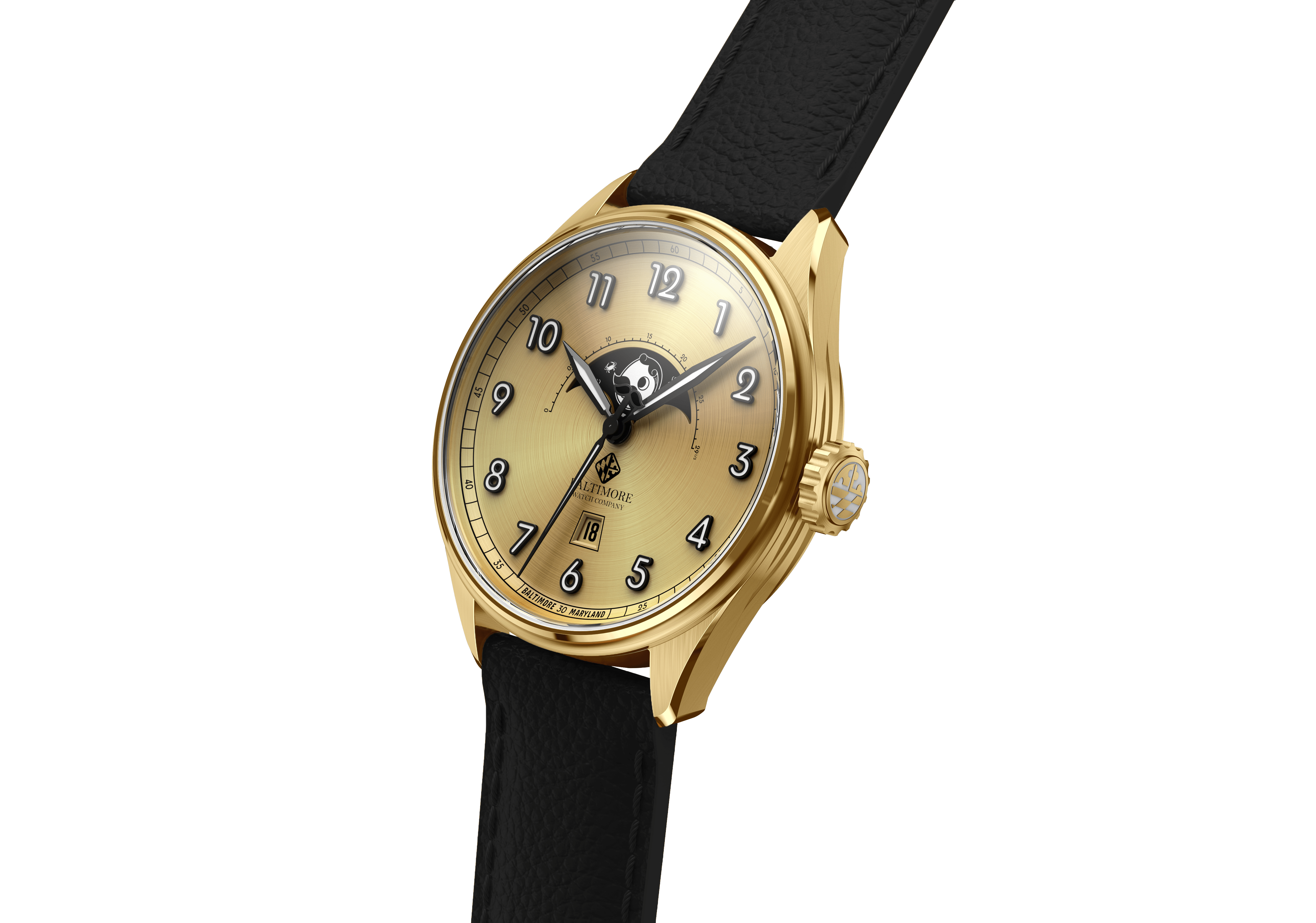 Limited to only 100 timepieces, the Natty Boh Moon - Vintage Gold is our take on a vintage timepiece mixed with Natty Boh pride. Powered by a Swiss Quartz movement with a Moonphase complication, this piece measures 40mm in diameter and only 10mm thick.