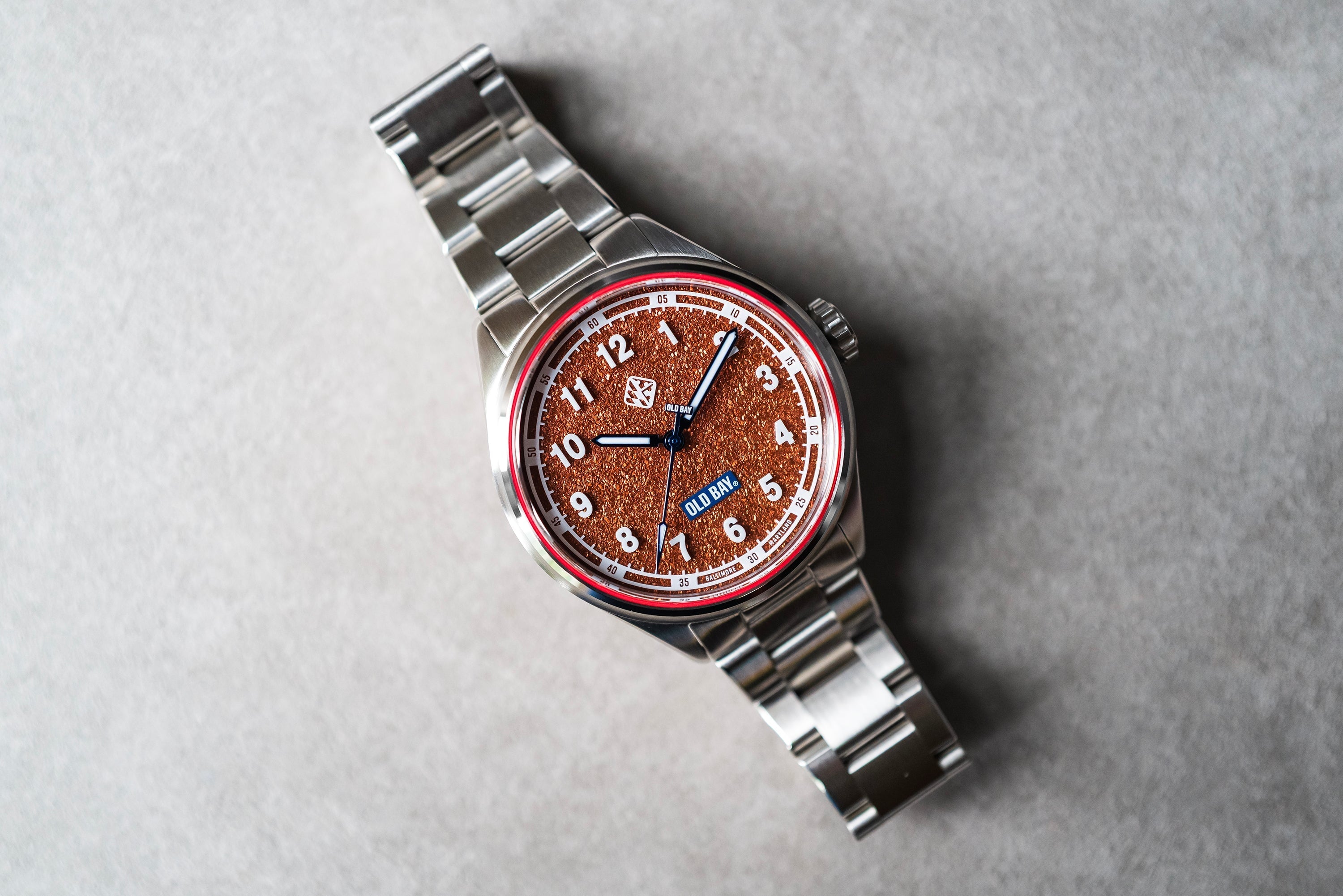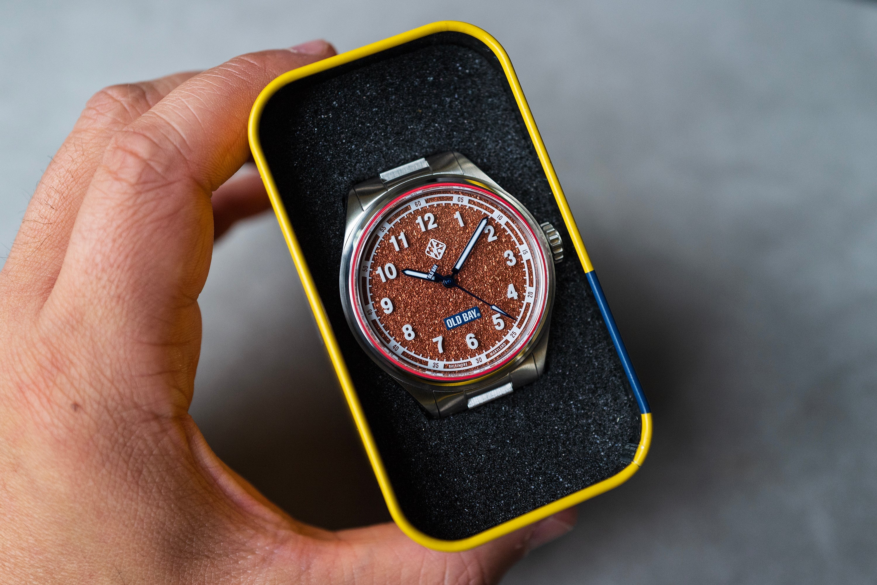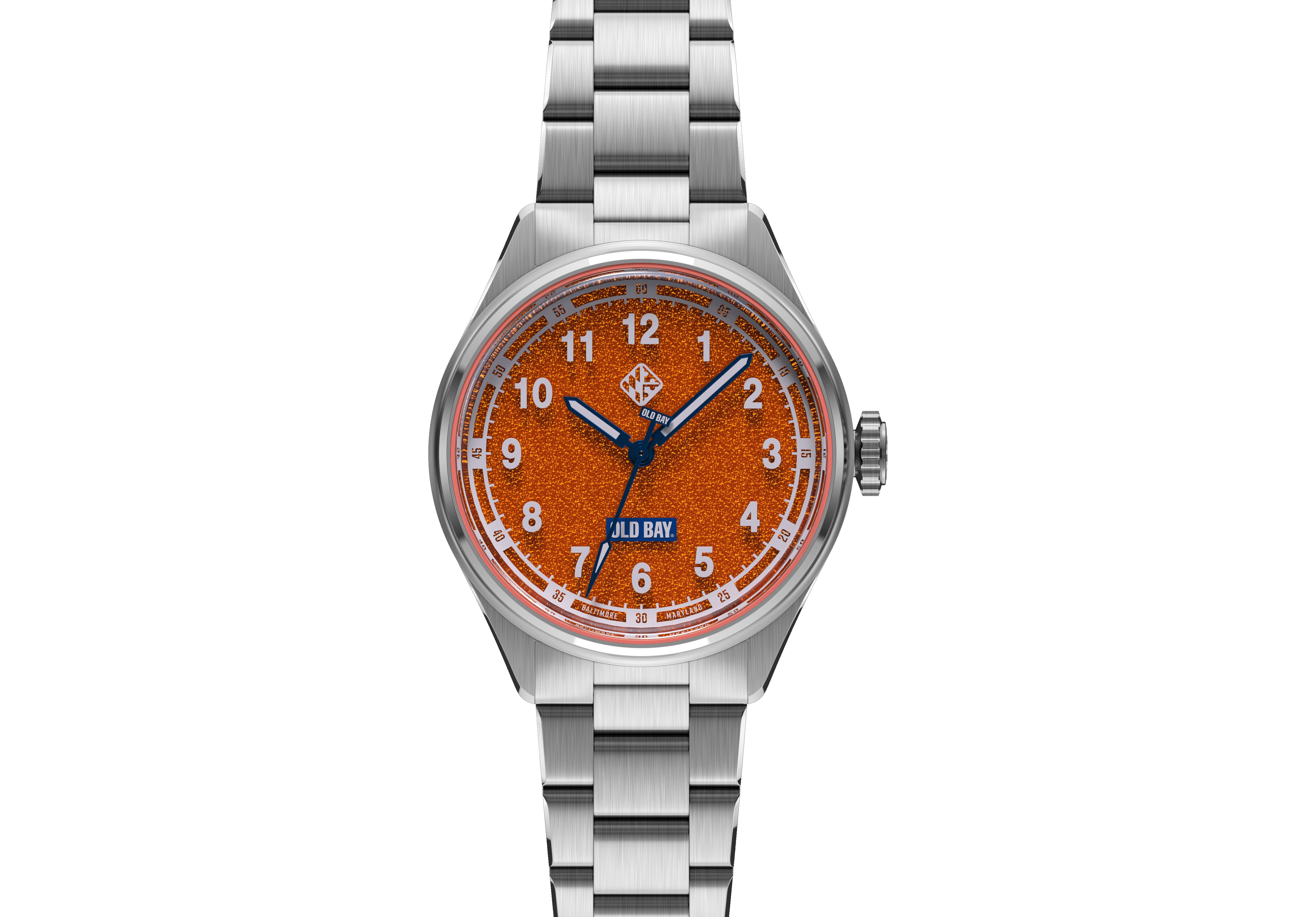 Old Bay® is not only iconic to Baltimore but to all of Maryland. We created this timepiece to give everyone an opportunity to wear a piece of Marylands story, but also enjoy the little things. Not everything has to be serious, but boy does this look seriously delicious! From the mouth watering Old Bay Spice texture on the dial to the sapphire glass hovering to create a unique floating effect with the hour markings. Everything designed on this watch is uniquely Maryland, and we're absolutey excited to see it on your wrist... Especially when you're eating some Maryland Crabs Hon!